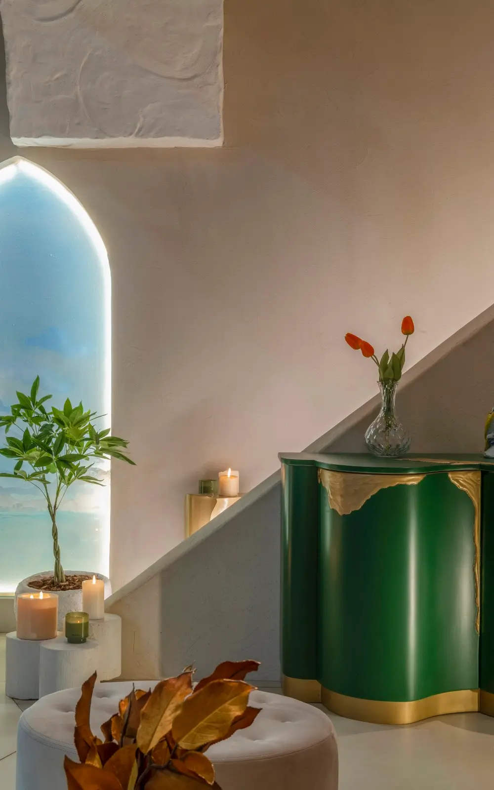 Diseño de aparador inspirado en los movimientos del mar con dorados con volúmenes como el reflejo del sol y la espuma de las olas